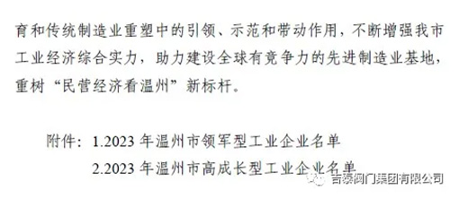 近日,温州市政府对全市工业企业进行各项数据评比,公布2023年温州市领军型工业企业100家、高成长型工业企业195家名单,吉泰阀门集团荣获23年温州市高成长型工业企业。